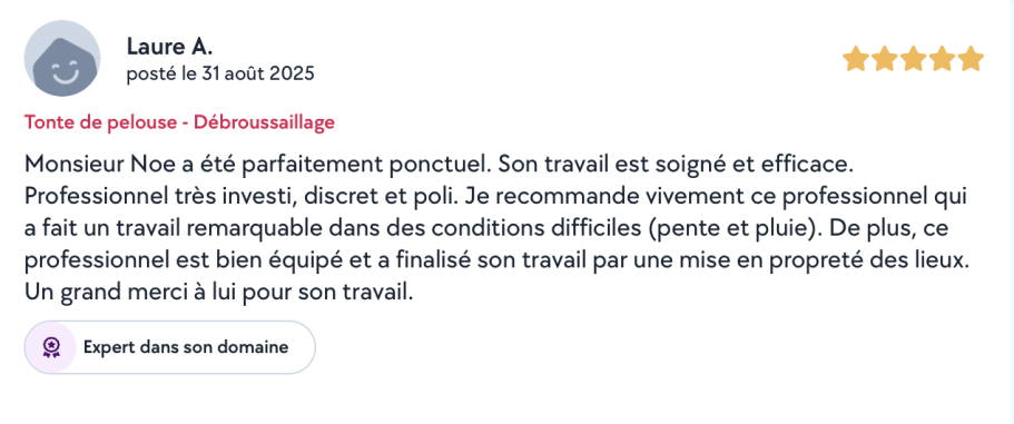 Que ce soit pour une intervention ponctuelle ou un entretien régulier, je m’engage à fournir un travail propre, efficace et durable, avec un seul objectif : votre satisfaction.